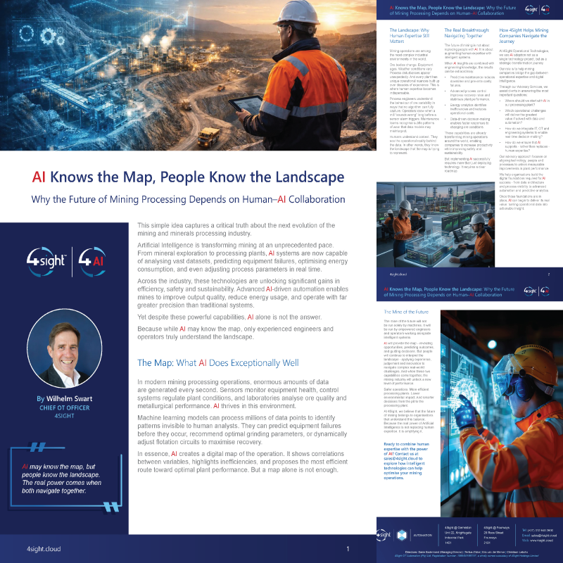 The mine of the future will not be run solely by machines. It will be run by empowered engineers and operators working alongside intelligent systems. AI will provide the map - revealing opportunities, predicting outcomes, and guiding decisions. But people will continue to interpret the landscape - applying experience, judgement and innovation to navigate complex real-world challenges. And when these two capabilities come together, the mining industry will unlock a new level of performance. Safer operations. More efficient processing plants. Lower environmental impact. And smarter decisions from the pit to the processing plant. At 4Sight, we believe that the future of mining belongs to organisations that understand this balance. Because the real power of Artificial Intelligence is not replacing human expertise. It is amplifying it.