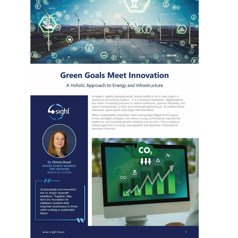 target lies the backbone of modern operations: the electrical infrastructure. From power distribution networks and switchgear to monitoring systems and control layers, this infrastructure determines how efficiently and reliably an organisation uses energy. Traditional systems were designed for stability and safety — vital attributes in their time. However, today’s energy and sustainability challenges demand more: connectivity, intelligence, and visibility. Modern organisations require infrastructures that do more than deliver power; they must enable insight, control, and adaptability across the enterprise. By digitising electrical networks and integrating them with operational technology (OT) and information technology (IT), businesses gain a real-time understanding of how energy flows through their operations. This integration bridges the gap between the physical and digital worlds — enabling better decisions, faster responses, and greater operational resilience. This is where 4Sight OT Automation plays a critical role. With proven expertise in electrical systems, system integration, industrial connectivity, and digital energy solutions, our team ensures that these technologies work seamlessly together. From the sensor level through to enterprise data systems, we deliver end-to-end visibility, secure communication, and consistent data integrity. Our holistic integration approach gives clients peace of mind — knowing that their electrical infrastructure is intelligent, connected, and ready to support both operational performance and sustainability objectives. This connected view, referred to as Digital Energy, transforms energy from a passive utility into an actively managed resource. The result is greater reliability, improved safety, and measurable progress toward corporate sustainability goals.
