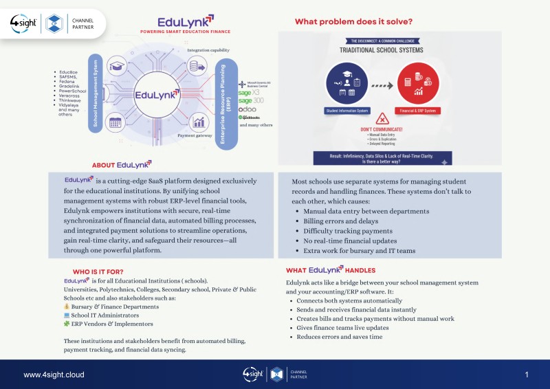 Edulynk is a powerful SaaS platform designed to modernize and streamline financial operations within educational institutions. Acting as an intelligent bridge between school management systems and enterprise-level ERP solutions, Edulynk eliminates the disconnect that often leads to data silos, manual entry errors, delayed reporting, and inefficiencies. By enabling secure, real-time synchronization of financial data, the platform ensures that bursary teams, finance departments, and IT administrators gain immediate clarity and control over all financial activities.
