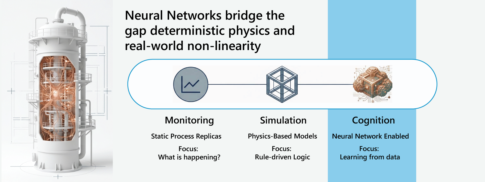 Traditional Digital Twins rely on physics-based models and rule-driven logic to mirror real-world assets and processes. Neural Networks complement these foundations by learning complex, non-linear relationships directly from operational data — relationships that are often difficult or impossible to model using deterministic equations alone.