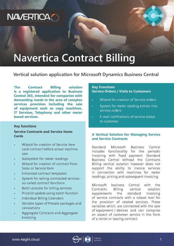 The Navertica Contract Billing solution is a vertical application built on Microsoft Dynamics 365 Business Central, designed for companies offering complex, service-based products such as IT services, telephony, and meter-based equipment rentals. While standard Business Central supports periodic invoicing, this solution adds functionality for managing services tied to equipment usage, allowing automatic invoicing based on meter readings, pricing structures, and service variables.