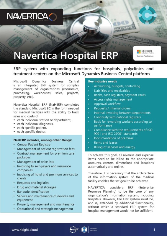 Navertica Hospital ERP (NaHERP) is an advanced ERP system built on Microsoft Dynamics Business Central, tailored for hospitals, clinics, and treatment centers. It enhances standard ERP capabilities by enabling detailed tracking of financial and operational data for individual patients, doctors, and departments. NaHERP includes tools for patient registration, insurance and self-payer invoicing, contract and price list management, logistics, asset maintenance, and compliance with ISO 9001 and ISO 27001 standards. The system ensures seamless handling of accounting, budgeting, and billing processes within a unified digital environment.