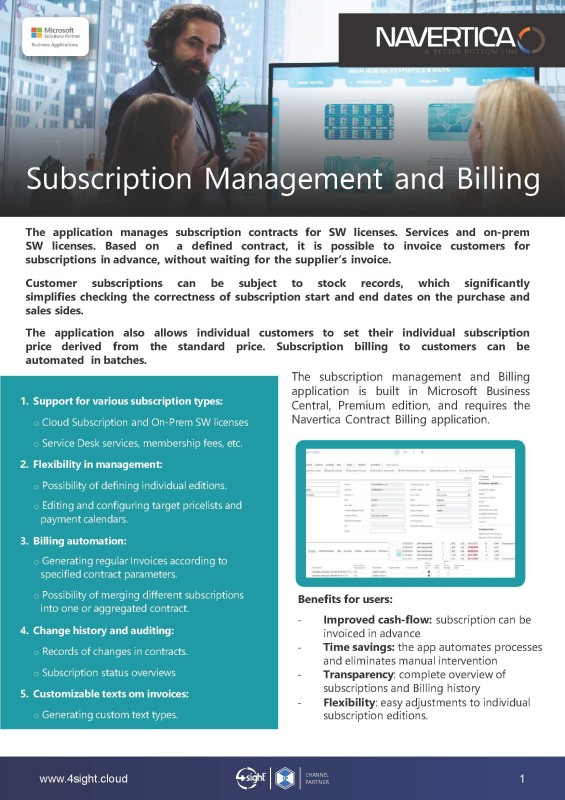 Navertica Subscription Management and Billing is an advanced application built on Microsoft Dynamics 365 Business Central, designed to automate and simplify the handling of software and service subscriptions. It supports both cloud-based and on-premises software licenses, as well as additional services like Service Desk and membership fees. The system allows organizations to invoice customers in advance based on contract terms, improving cash flow and reducing administrative effort.
