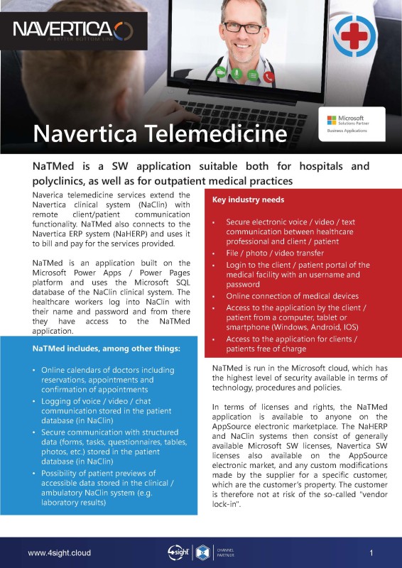 Navertica Telemedicine (NaTMed) is a secure digital platform that extends the Navertica Clinical System (NaClin) by enabling remote communication between healthcare professionals and patients. Built on Microsoft Power Apps and Power Pages, NaTMed integrates with both NaClin and the Navertica ERP (NaHERP) systems to support appointment scheduling, patient data sharing, and automated billing. It allows for real-time voice, video, and chat consultations while ensuring all interactions are securely stored in the patient’s electronic medical record.